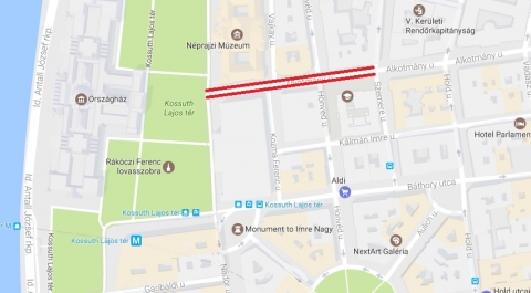 Alkotmány utca mindkét oldalán, a Kossuth tér és a Szemere utca között.