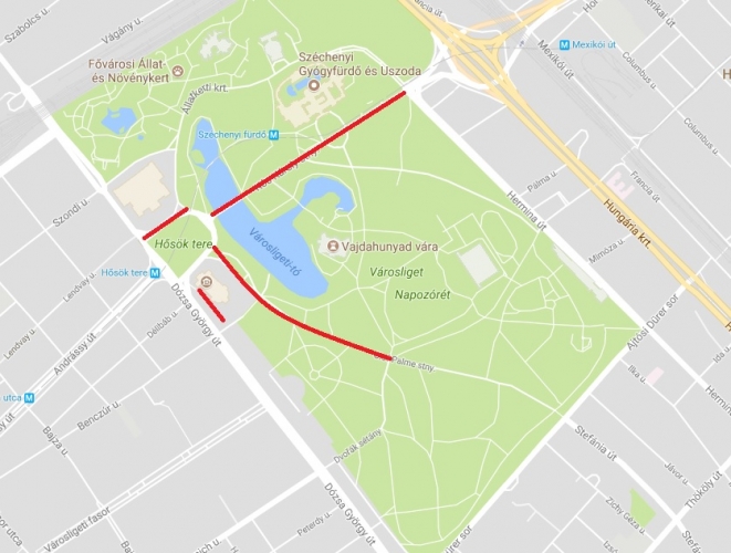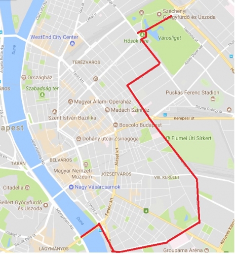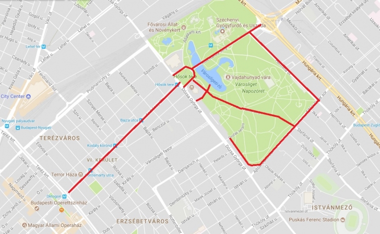 Kós Károly sétány - Hősök tere - Andrássy út (oda-vissza) a Hősök tere és az Oktogon között - Dózsa György út - Olof Palme sétány - Asztana utca - Ajtósi Dürer sor - Hermina út - Kós Károly sétány.