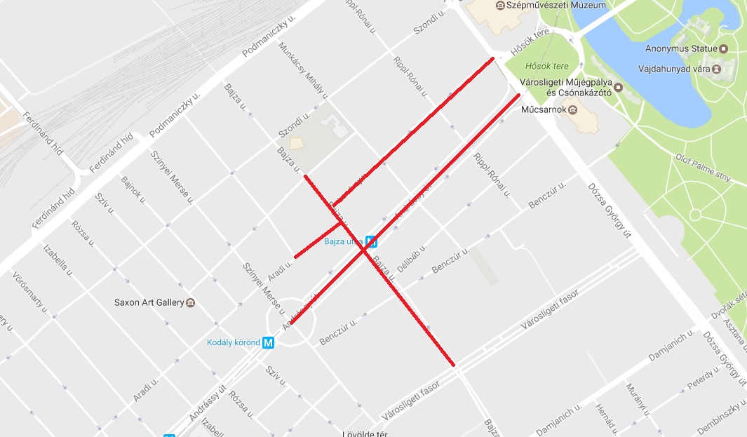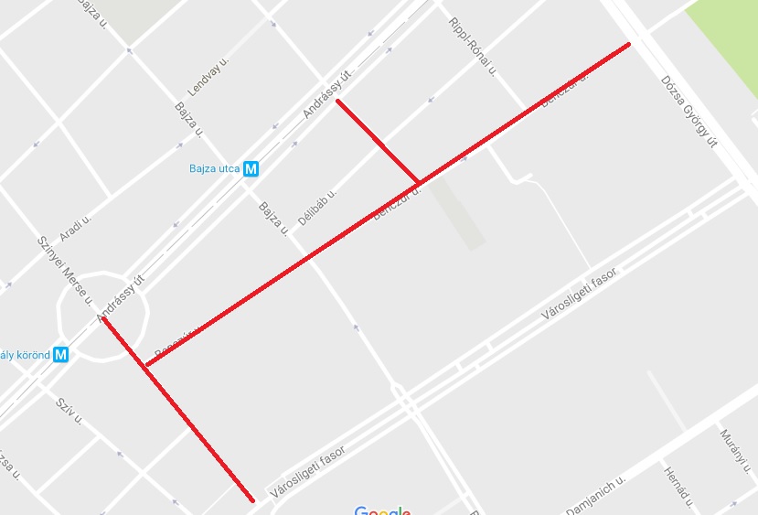 Felsőerdősor utca – Benczúr utca – Munkácsy Mihály utca.