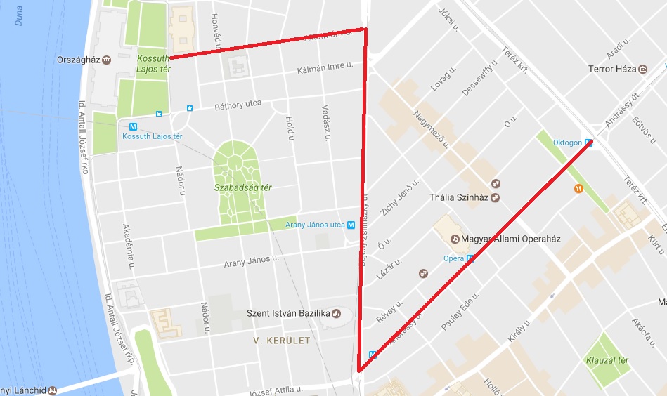 Oktogon – Andrássy út – Bajcsy-Zsilinszky út – Alkotmány utca – Kossuth tér útvonalat,