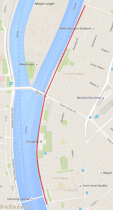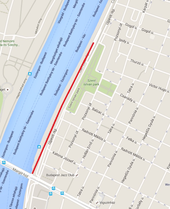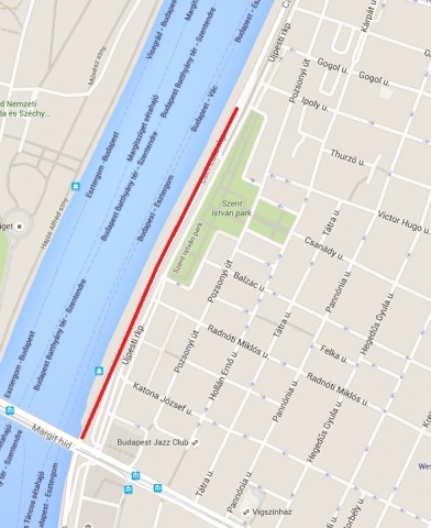 Pesti alsó rakparton a Margit híd és Szent István park között.