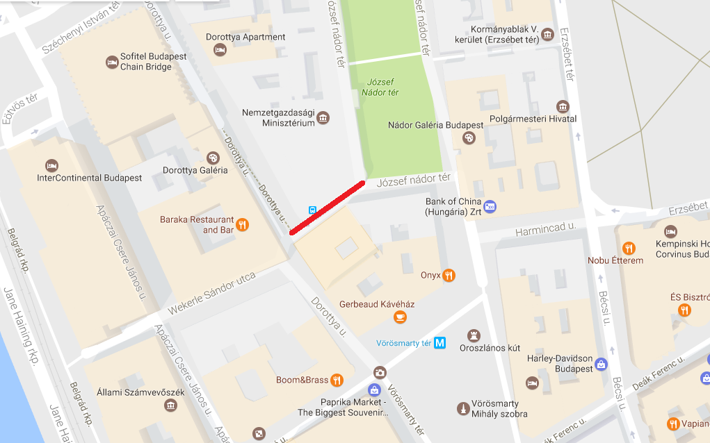 Wekerle Sándor utca (Nemzetgazdasági Minisztérium épületével szemben), a Dorottya utca és a József Nádor tér között.