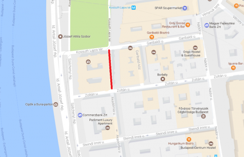 Akadémia utca páratlan oldalán a Zoltán utca és a Garibaldi utca között.