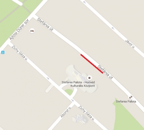 Stefánia út páros számozású oldalán a 34. szám Stefánia Palota főbejárata előtt.