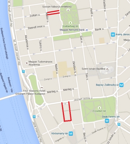 Zoltán utca mindkét oldalán a Nádor utca és a Szabadság tér között.
