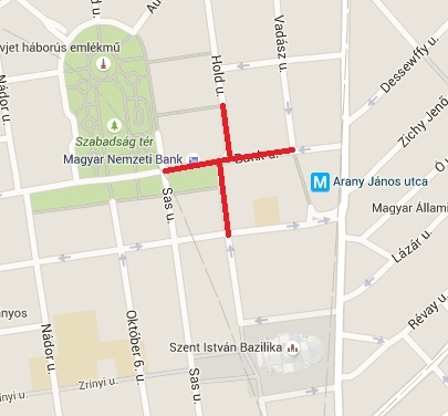 Hercegprímás utca mindkét oldalán az Arany János utca és a Bank utca között,