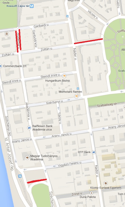 Akadémia utca mindkét oldalán a Zoltán utca és a Kossuth tér között.