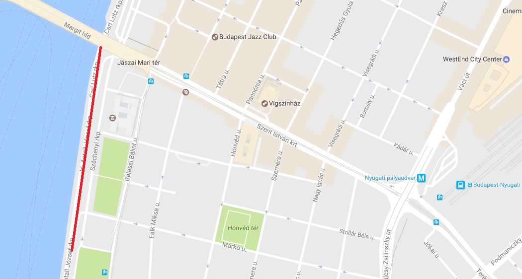 Pesti alsó rakparton a Markó utcai lehajtó és a Margit híd között.