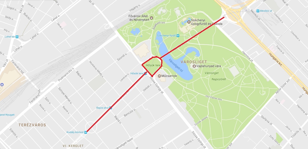 Kodály körönd – Andrássy út (Hősök tere irányú forgalmi sávjai) – Hősök tere – Kós Károly sétány – Városligeti körút útvonalat.