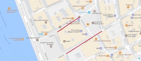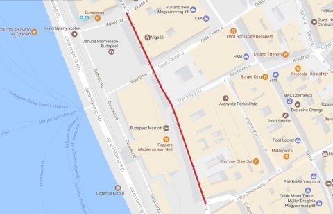 Vígadó utca mindekét oldalán a Vörösmarty tér és az Apáczai Csere János utca között,