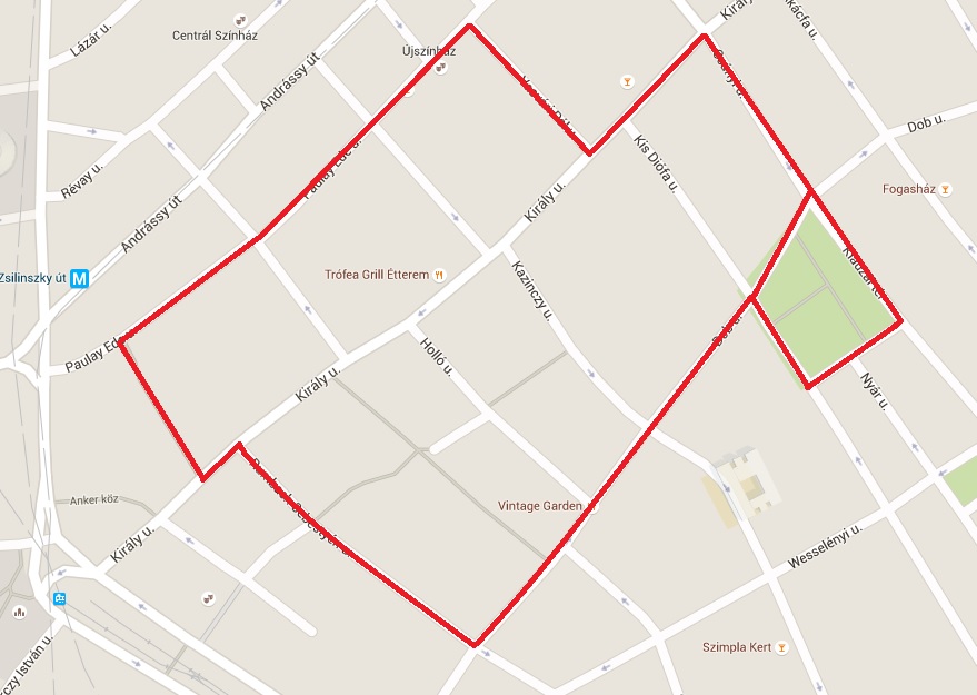 Rumbach Sebestyén utca - Dob utca - Klauzál tér - Csányi utca - Király utca - Vasvári Pál utca - Paulay Ede utca - Rumbach Sebestyén utca útvonal.