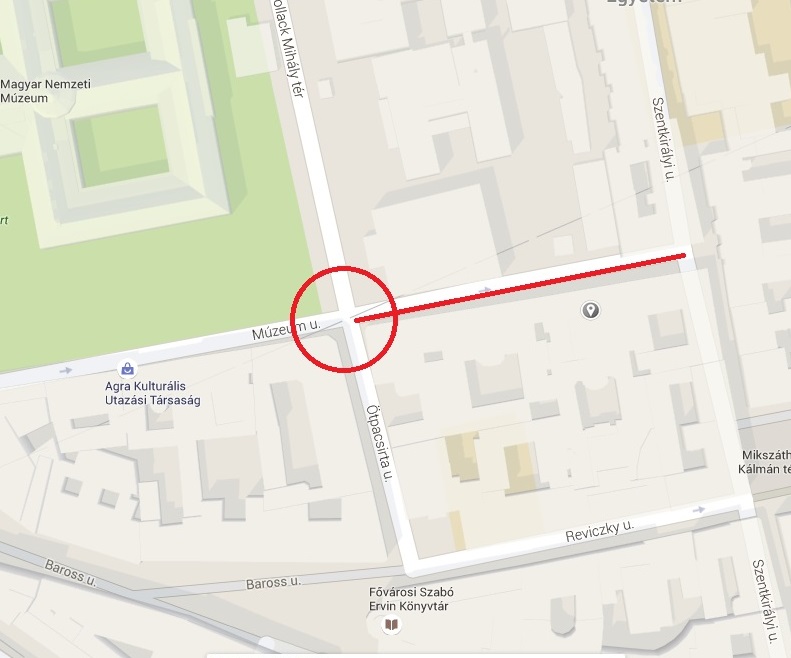 Múzeum utca – Ötpacsirta utca – Pollack Mihály tér kereszteződésében.