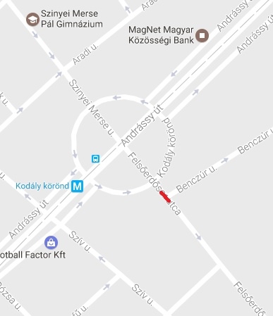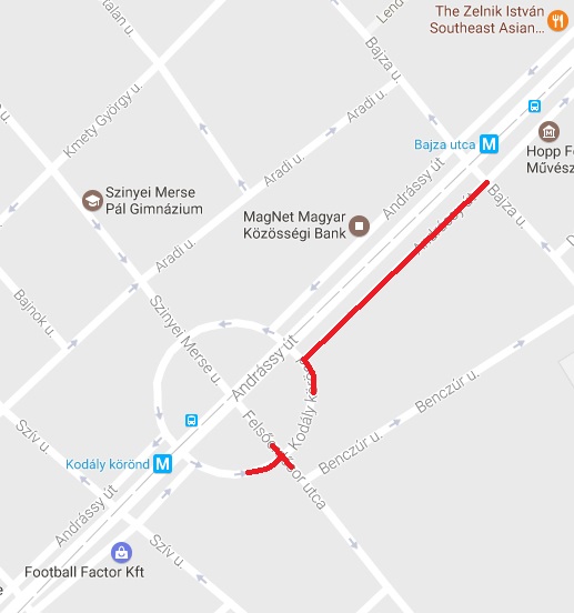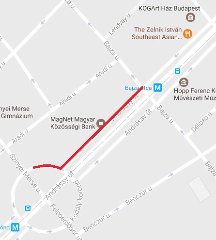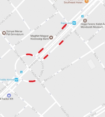 2017. június 6-án 12 óra és június 9-én 24 óra között VI. Andrássy úti páros oldali szervízút Bajza utca és Kodály körönd közötti szakasza, valamint a Kodály körönd 4. szám előtti szakaszt,