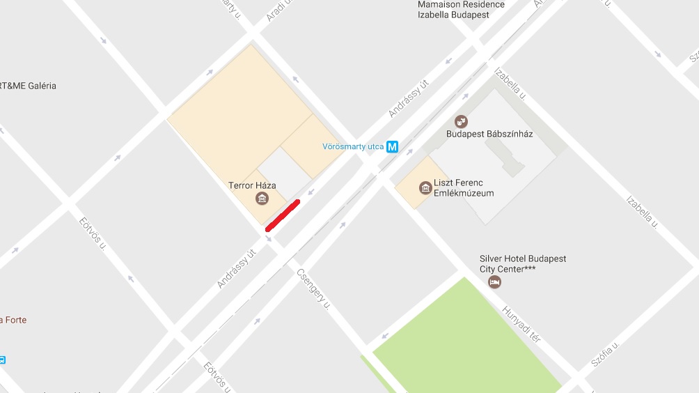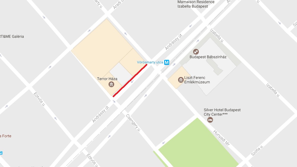 Andrássy út páros oldali szervizútja a Vörösmarty utca és a Csengery utca között.