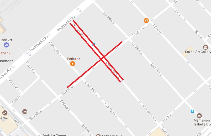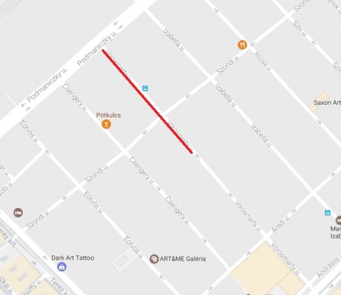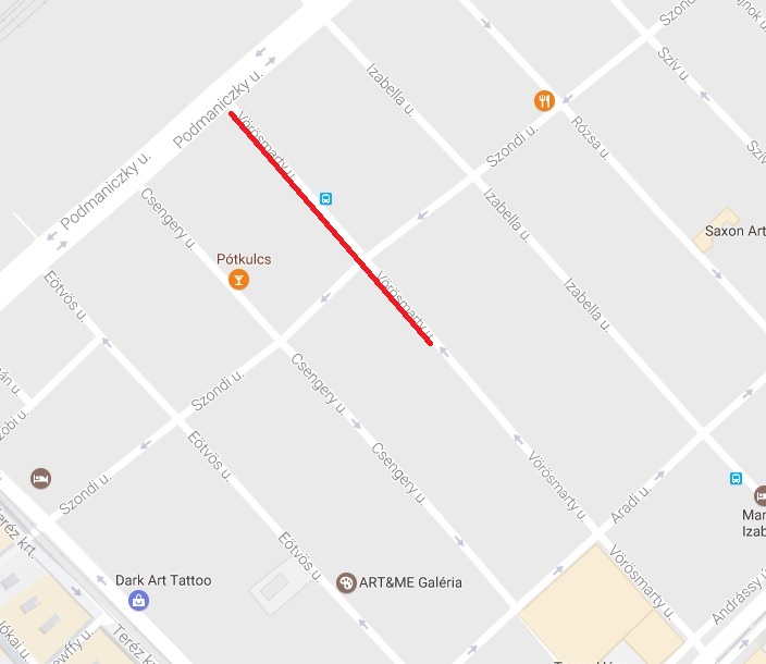 Vörösmarty utcát, a Vörösmarty utca 50. szám és a Podmaniczky utca között.