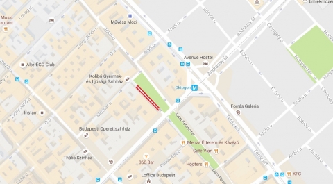 Jókai tér 5-7. szám előtti szakasza az Andrássy út és a Mozsár utca között.