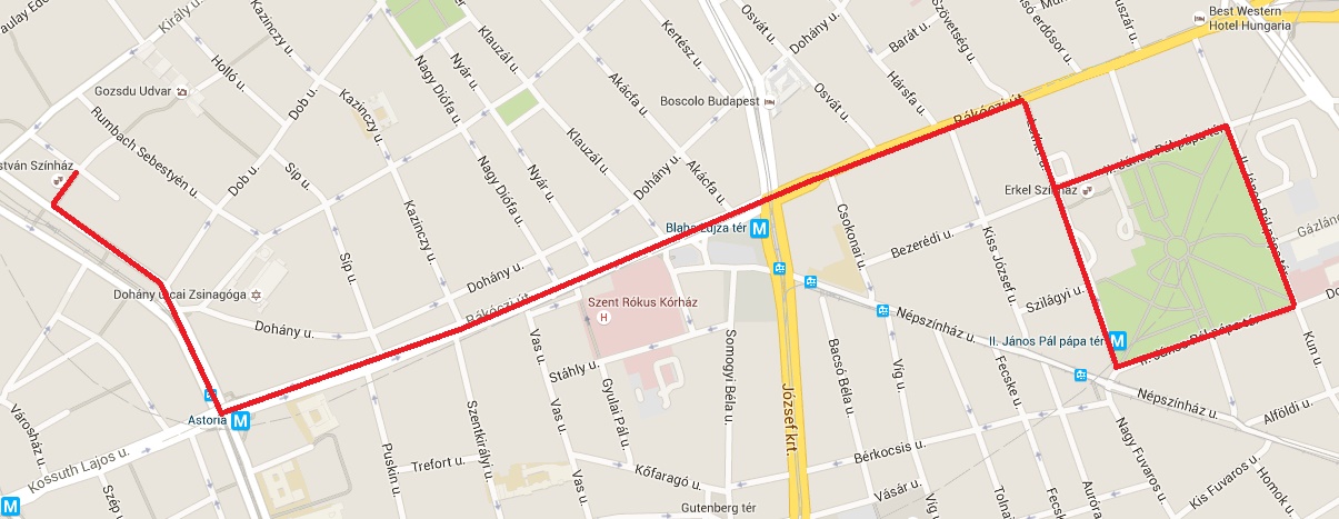 Madách Imre tér - Károly körút - Astoria - Rákóczi út - Luther utca - II. János Pál pápa tér útvonal.