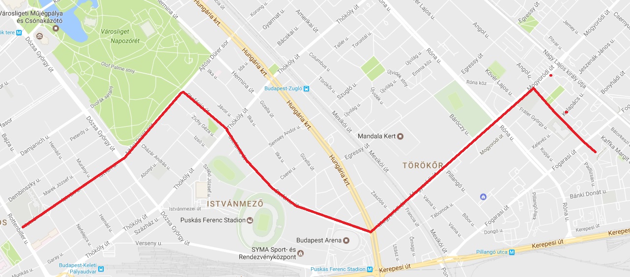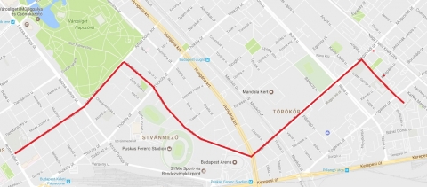 István utca – Ajtósi Dürer sor – Stefánia út – Mogyoródi út – Bagolyvár utca útvonal.