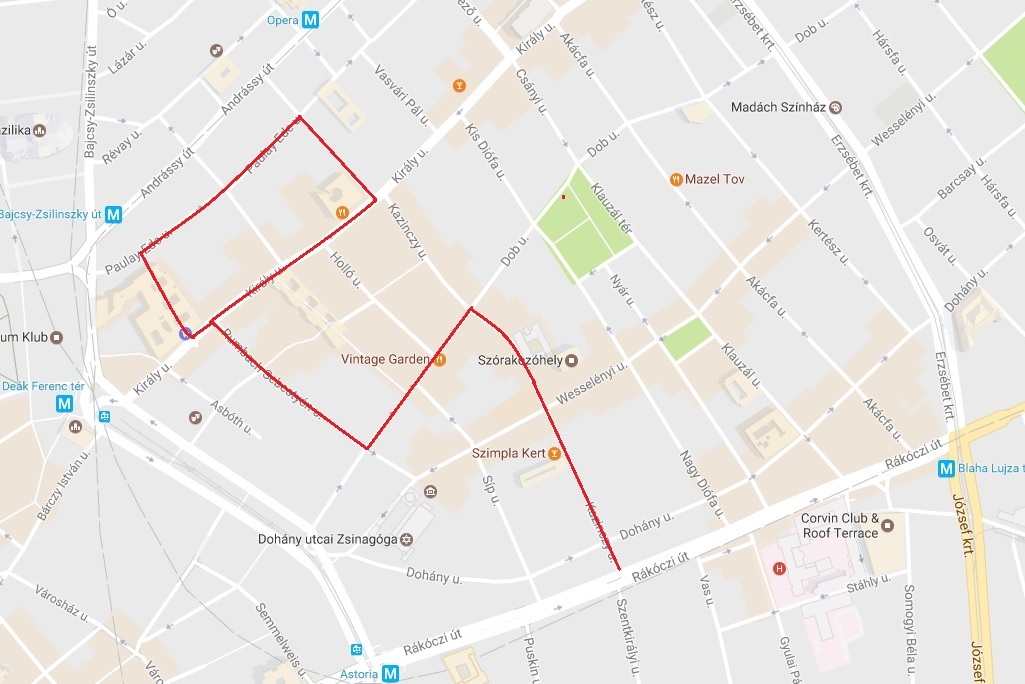 Kazinczy utca – Dob utca – Rumbach Sebestyén utca – Király utca – Székely Mihály utca – Paulay Ede utca – Passage – Király utca – Rumbach Sebestyén utca – Dob utca útvonalat.