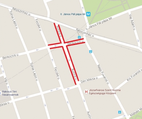 Auróra utca mindkét oldalán a Népszínház utca és a Déri Miksa utca között,