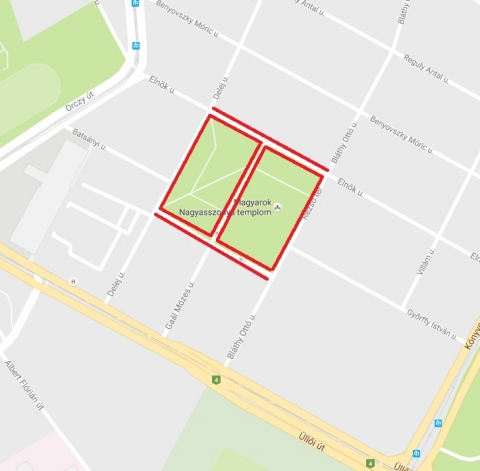 Rezső tér Üllői út felé eső oldalának mindkét oldalán a Delej utca és a Bláthy Ottó utca között,