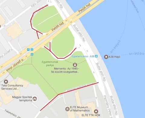 Magyar tudósok körútja mindkét oldalán a Pázmány Péter sétány és a Magyar Szentek temploma között,