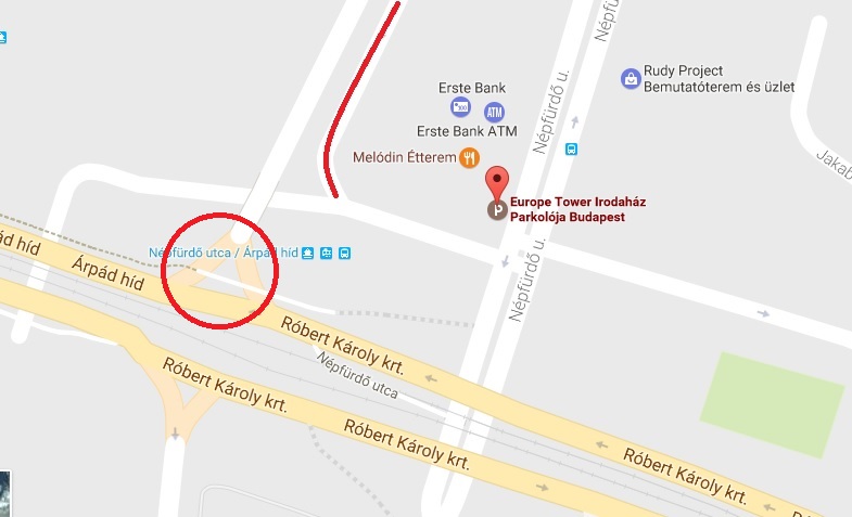 Europe Tower irodaház előtti szerviz út mindkét oldalán és az Árpád híd alatti parkolóban.