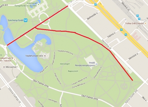 Városliget körúton a Zichy Mihály úttól mindkét irányban (Közlekedési Múzeum előtti, illetve a Petőfi Csarnok előtti területeken) a beton elemekig, mindkét oldalon, a Városligeti körúton a Kós Károly sétánytól a beton elemekig, mindkét oldalon.