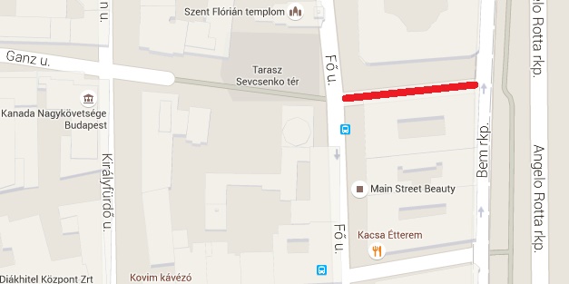 Ganz utca páros számozású oldalán a Fő utca és a Bem rakpart között.