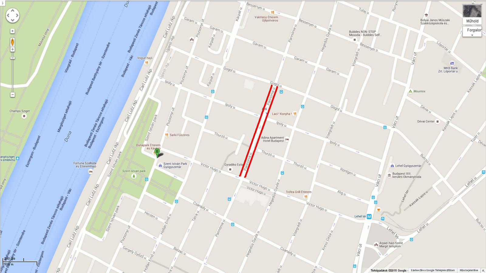 Pannónia utca mindkét oldalán a Viktor Hugó utca és a Gogol utca között.