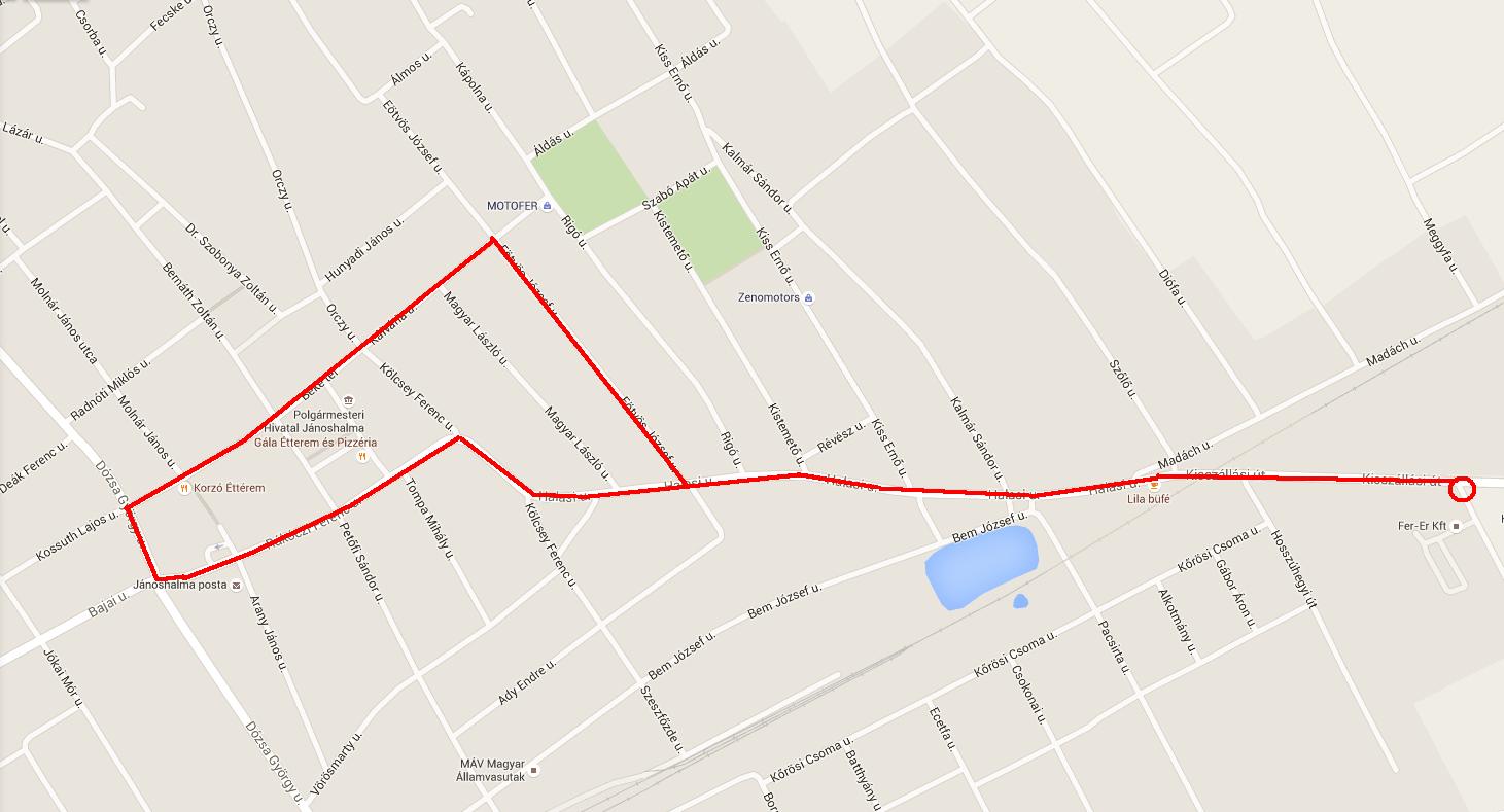 Jánoshalma, Kisszállási út - Halasi út - Kölcsey Ferenc utca - Rákóczi Ferenc utca - Dózsa György utca – Molnár János utca - Béke tér - Kálvária utca - Eötvös József utca - Halasi út.
