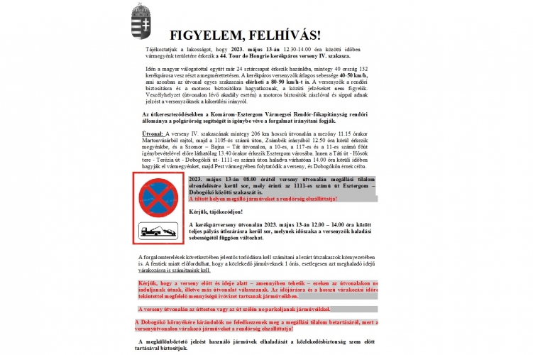 Szomor, Bajna, Tát és Esztergom térségében 2023. május 13-án haladnak át a versenyzők. A részletek a csatolmányban olvashatók.