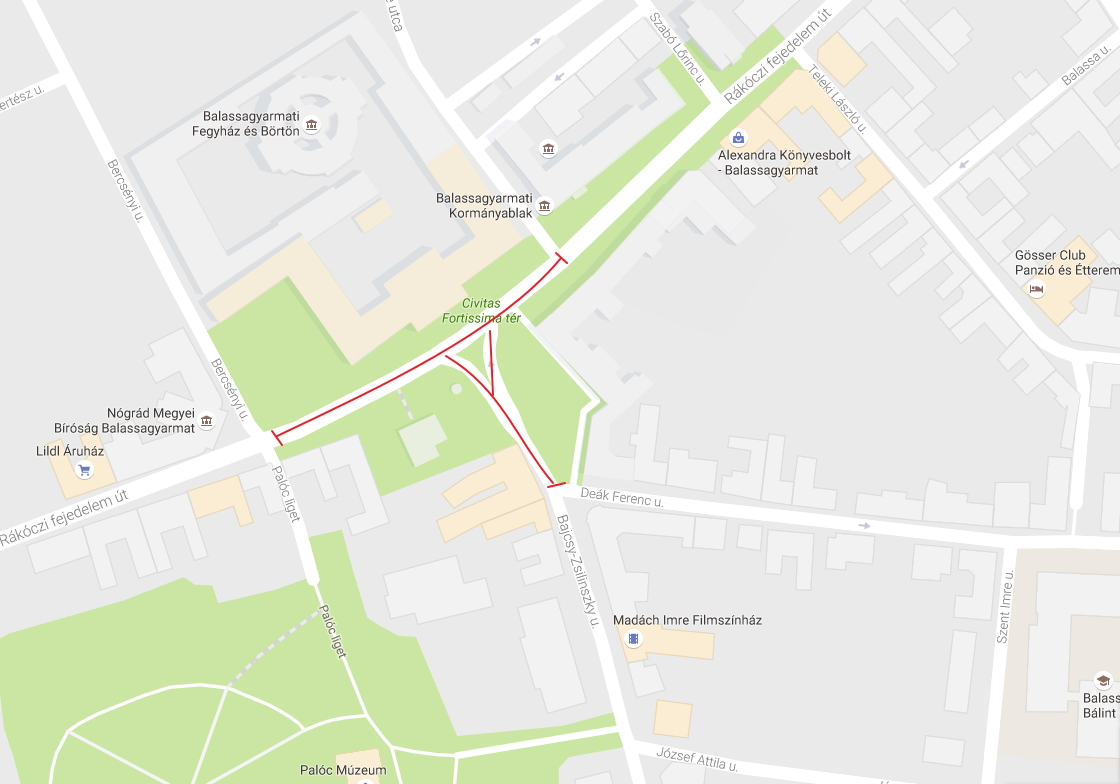 • 2016. augusztus 20-án 14 óra 30 perctől 23 óra 30 percig Balassagyarmat, Rákóczi Fejedelem úton, a Bercsényi út és a Madách út közötti szakaszán (Civitas Fortissima tér) , továbbá a Bajcsy-Zsilinszky úton, a Deák Ferenc út és Rákóczi Fejedelem út közötti szakaszán teljes útlezárás lesz érvényben. Elkerülésre az Ipolypart utca és az Ady Endre út irányába lesz lehetőség.