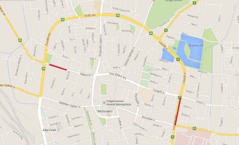 - a Rákóczi utcán a 44-es számtól a Búza tér irányában.