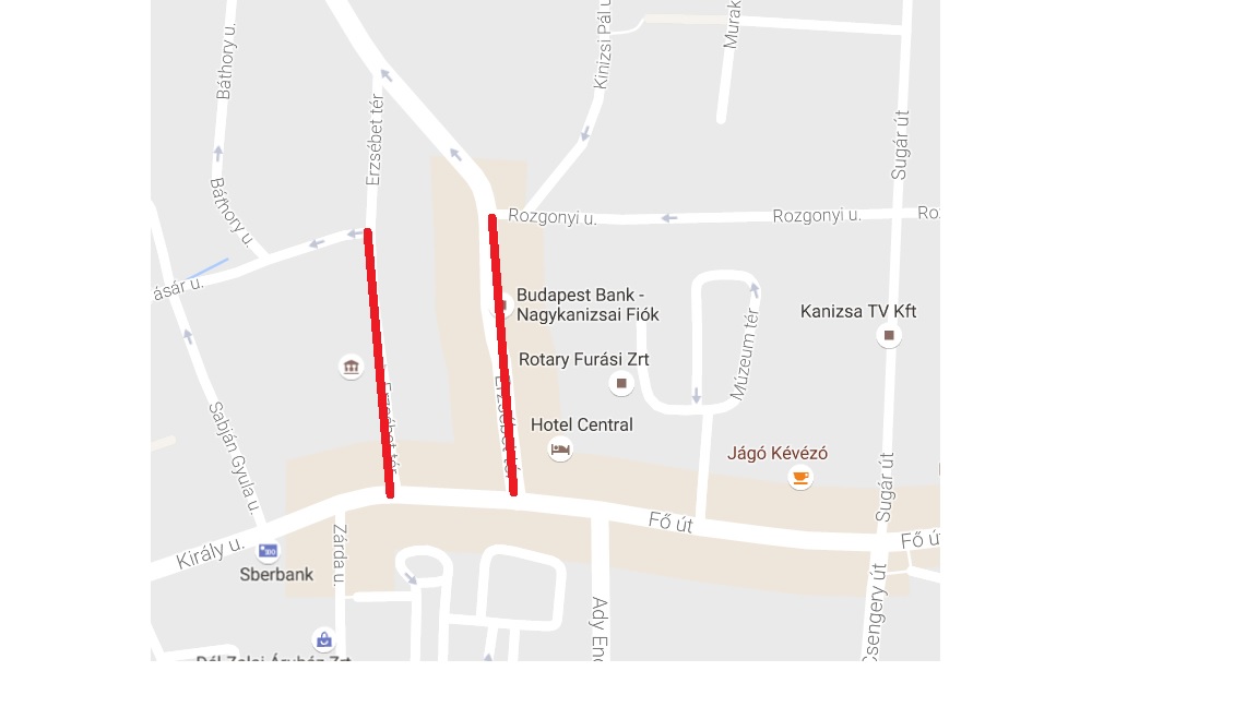 2016. augusztus 20-án Nagykanizsán, az Erzsébet Tér keleti részénél, a Rozgonyi út és a Főút közötti szakaszon, valamint az Erzsébet tér nyugati része, a Polgármesteri hivatal előtti szakaszon teljes útlezárás lesz érvényben reggel 6 órától 2016. augusztus 21-én 3 óráig.