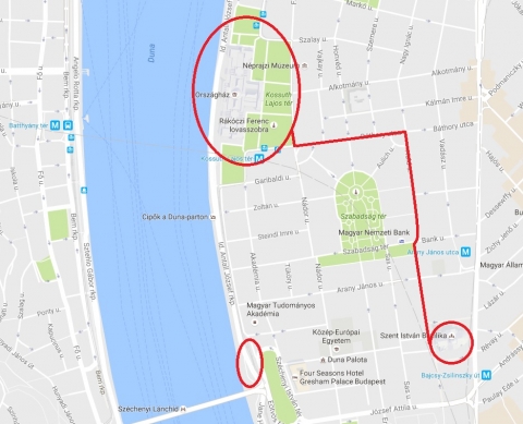 Szent István tér – Hercegprímás utca – Hold utca – Báthory utca – Kossuth tér útvonal.