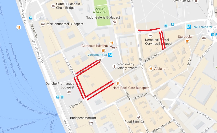 Vigadó utca mindkét oldalán az Apáczai Csere János utca és a Vörösmarty tér között,
