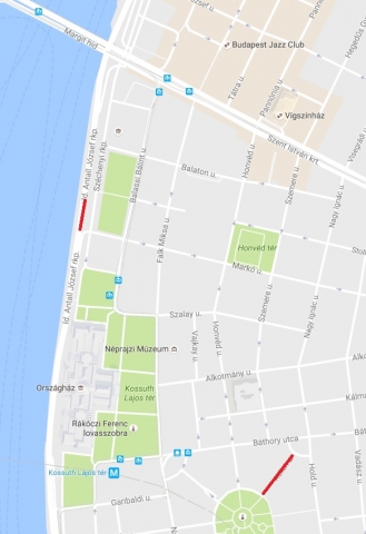 Pesti alsó rakparton a Markó utcától 50 méter hosszan a Margit híd felé.