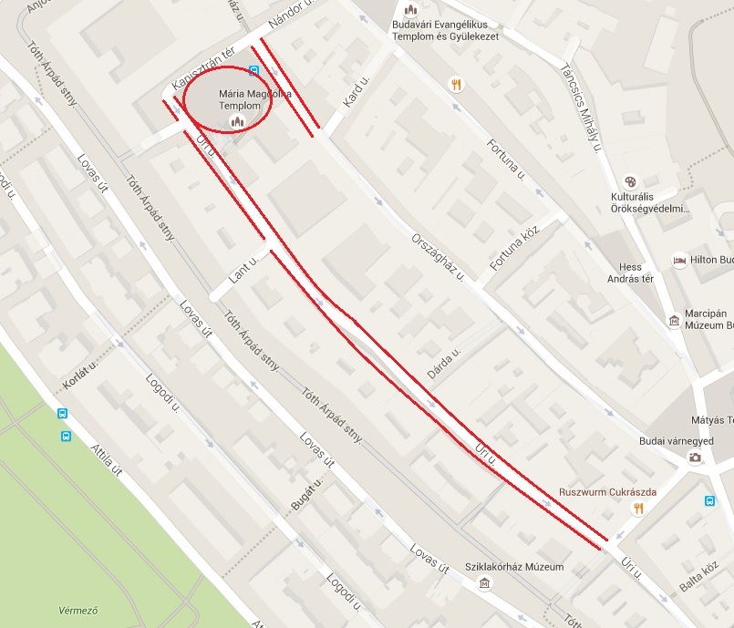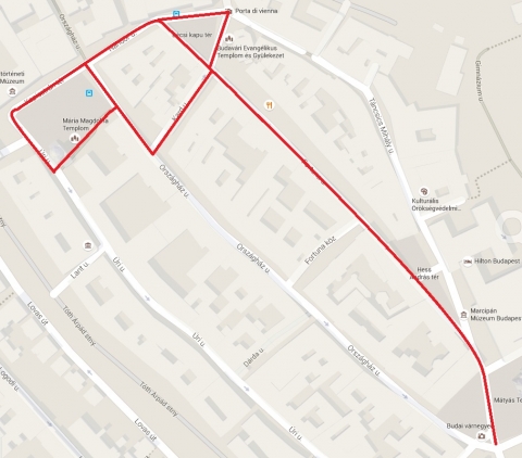 Szentháromság tér - Fortuna utca - Bécsi kapu tér - Nándor utca - Kapisztrán tér útvonalat, majd a Kapisztrán tér - Úri utca - Mária Magdolna torony - Országház utca - Kard utca - Fortuna utca - Bécsi kapu tér - Nándor utca - Kapisztrán tér útvonalat.