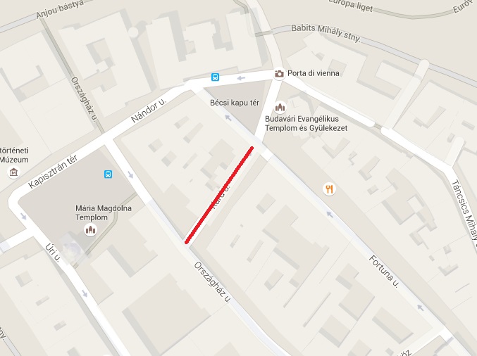 Országház utca mindkét oldalán a Kapisztrán tér és a Fortuna köz között,
