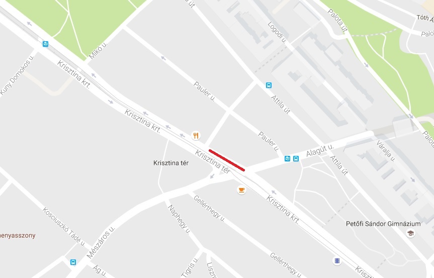 Krisztina tér 1-2. szám előtt az Alagút utcától a Roham utca felé haladó forgalmi sáv.