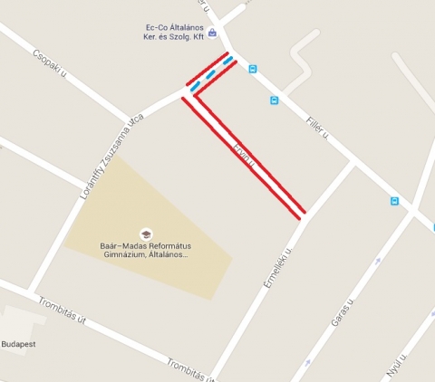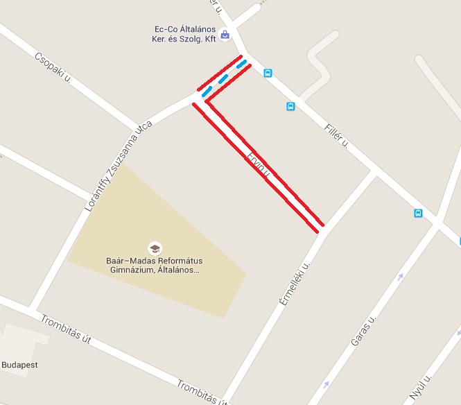 Ervin utca mindkét oldalán a Lorántffy Zsuzsanna utca és az Érmelléki utca között.
