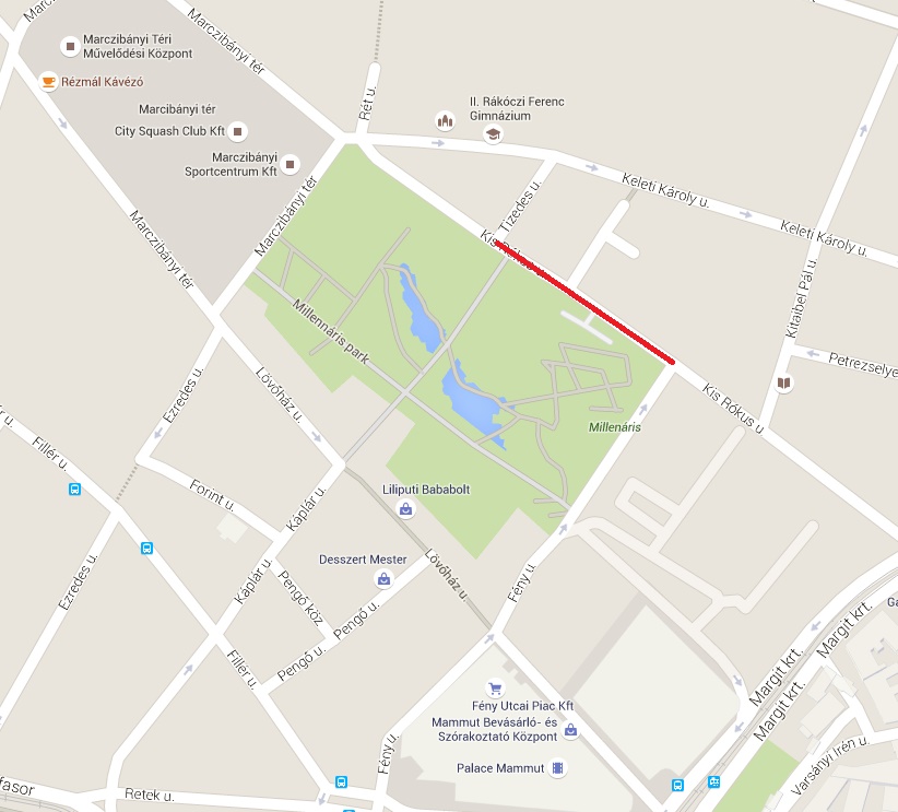 Kis Rókus utca mindkét oldalán a Fény utca és a Tizedes utca között.