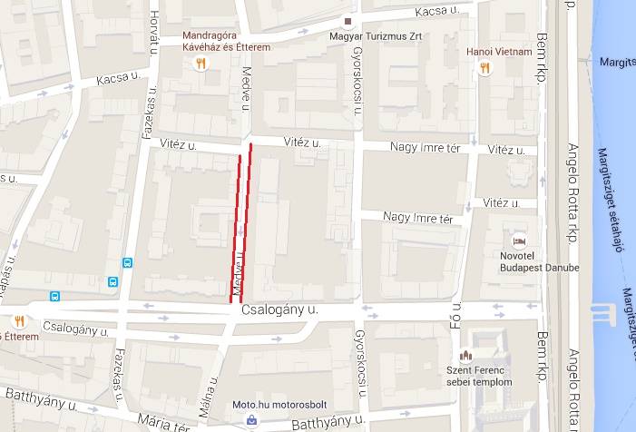 Medve utca mindkét oldalán a Vitéz utca és a Csalogány utca között.