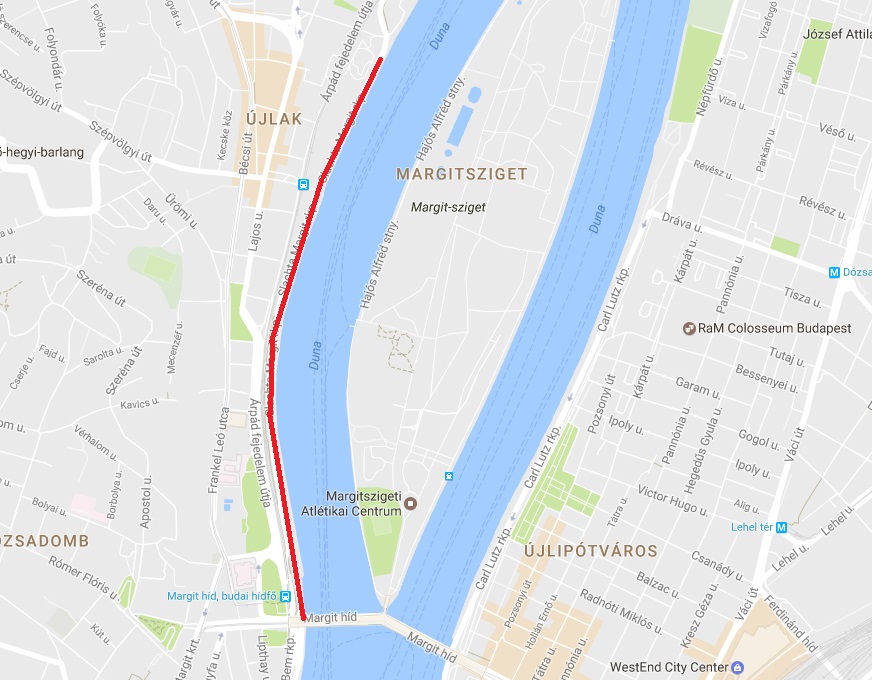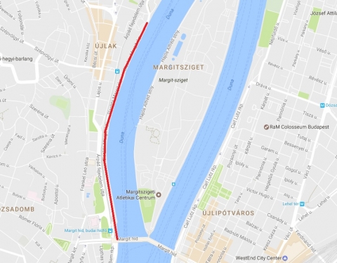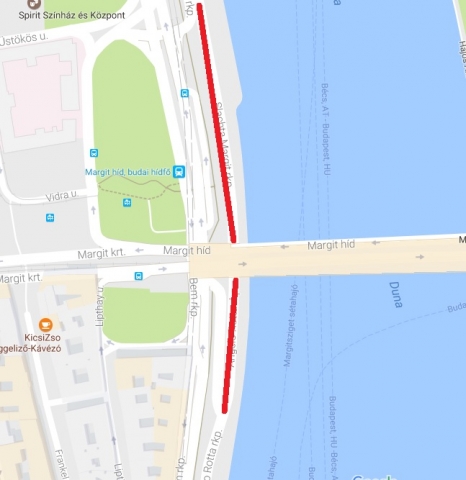 Budai alsó rakpart a Margit híd északi és déli lehajtója között.