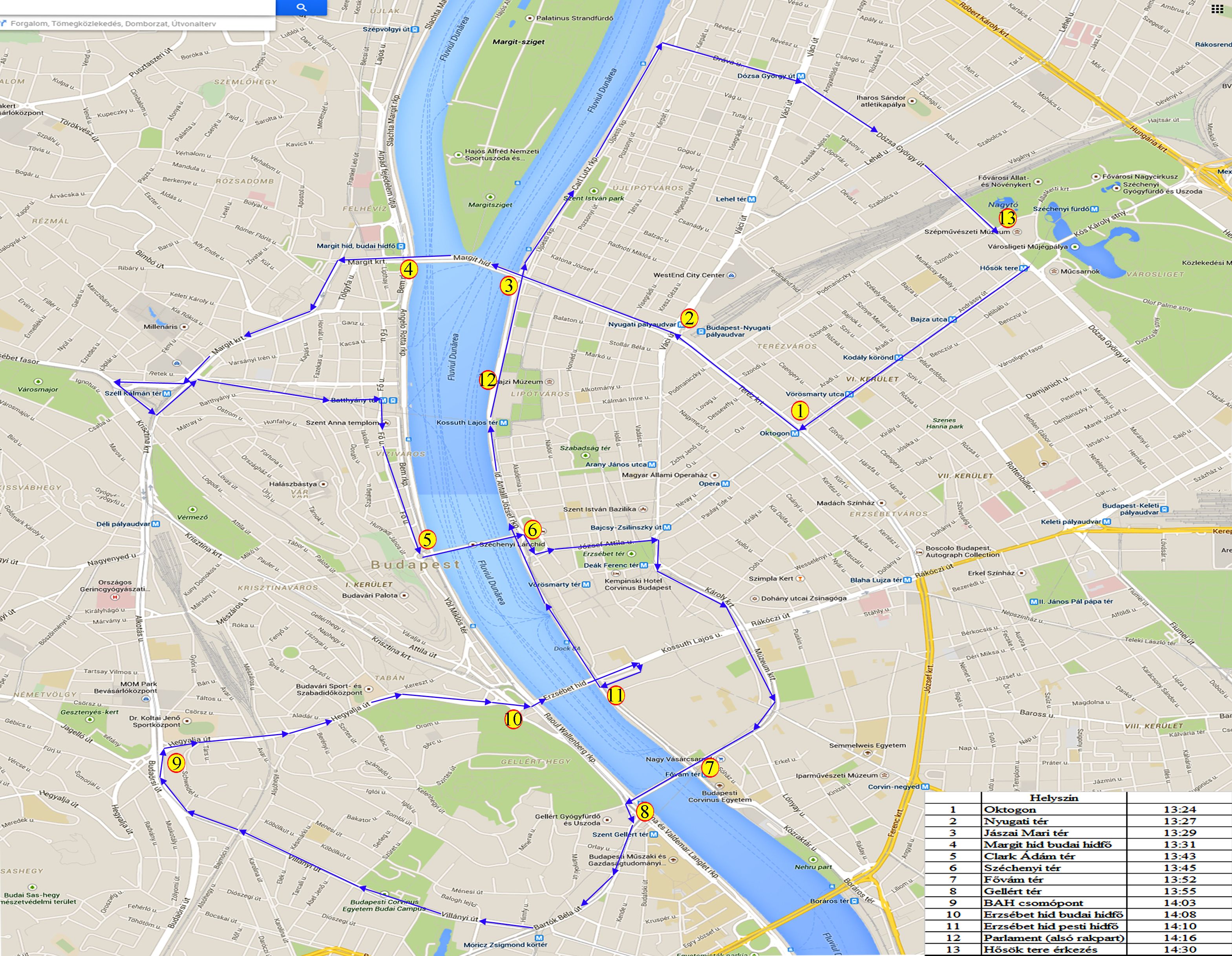 Hősök tere – Oktogon – Nyugati pályaudvar – Jászai Mari tér – Margit híd – Margit körút - Széll Kálmán tér-Batthyány tér - Fő utca - Clark Ádám tér – Lánchíd - Széchenyi tér - József Attila utca - Károly körút -Múzeum körút - Fővám tér – Szabadság híd - Gellért tér - Bartók Béla út - Villányi út - BAH csomópont - Hegyalja út-Erzsébet híd - id.Antall József rakpart - Carl Lutz rakpart - Dráva utca-Dózsa György út - Hősök tere útvonal.