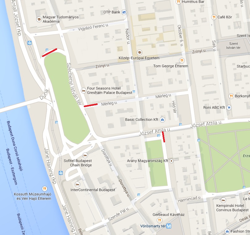 József nádor tér Erzsébet tér felőli részén a park felőli oldalon 50 méter hosszan a József Attila utcától,