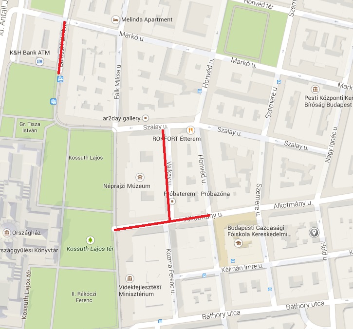 Alkotmány utca mindkét oldalán a Kossuth tér és a Honvéd utca között,