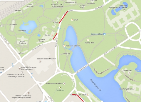 Állatkerti körúton a Gundel étterem előtt, valamint az Állatkert oldalában a főkaputól az Elefántos kapu felé 100 méter hosszan,