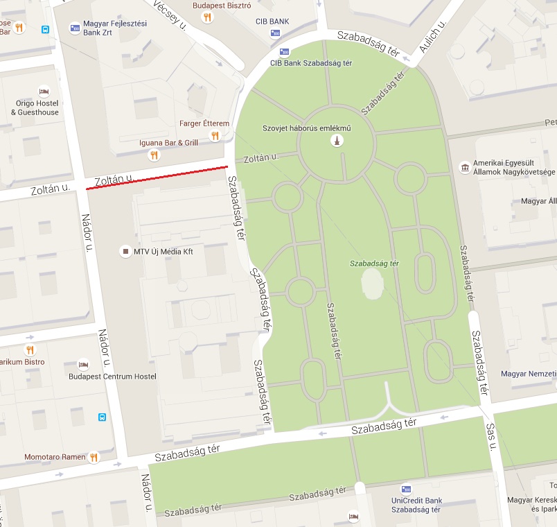 Zoltán utca MTV székház felőli oldalán a Nádor utca és a Szabadság tér között.
